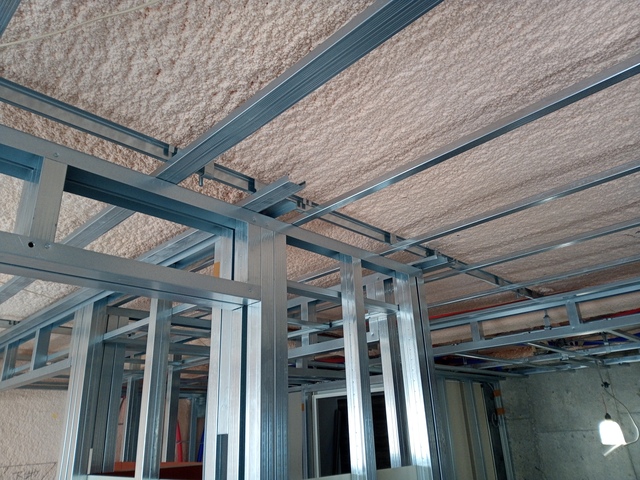 当社は、建物の内装工事における軽天工事を中心に、軽鉄下地の組み立てから石膏ボード施工までを一貫して対応しております。